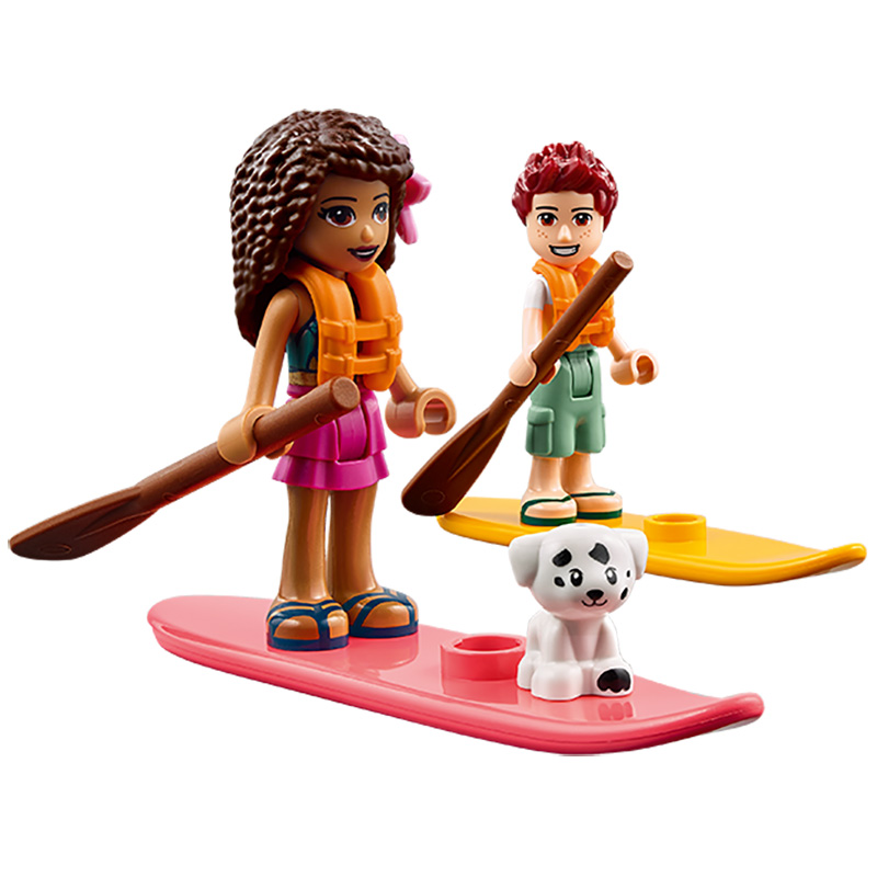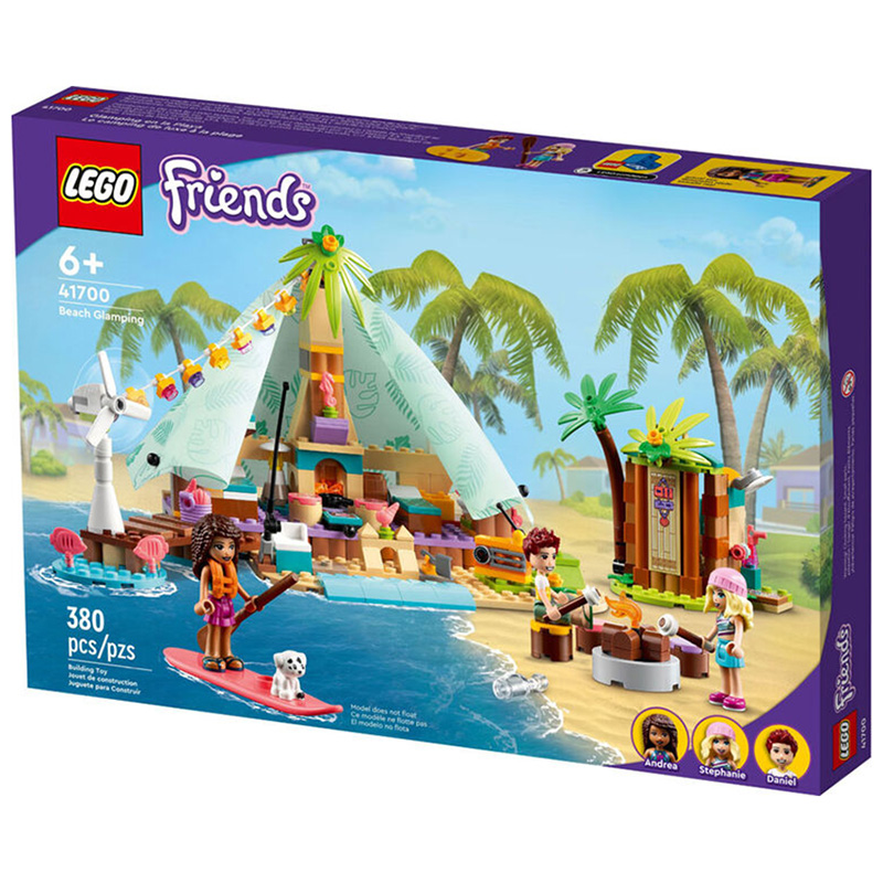 „Glamping pe plajă” LEGO® Friends Beach Glamping include 3 mini-păpuși, un cățeluș, cort cu paturi supraetajate, aragaz și husă din material, plus o turbină eoliană care se învârte pentru a alimenta luminile. Vârsta recomandată: 6+ Număr de piese: 380 Piese