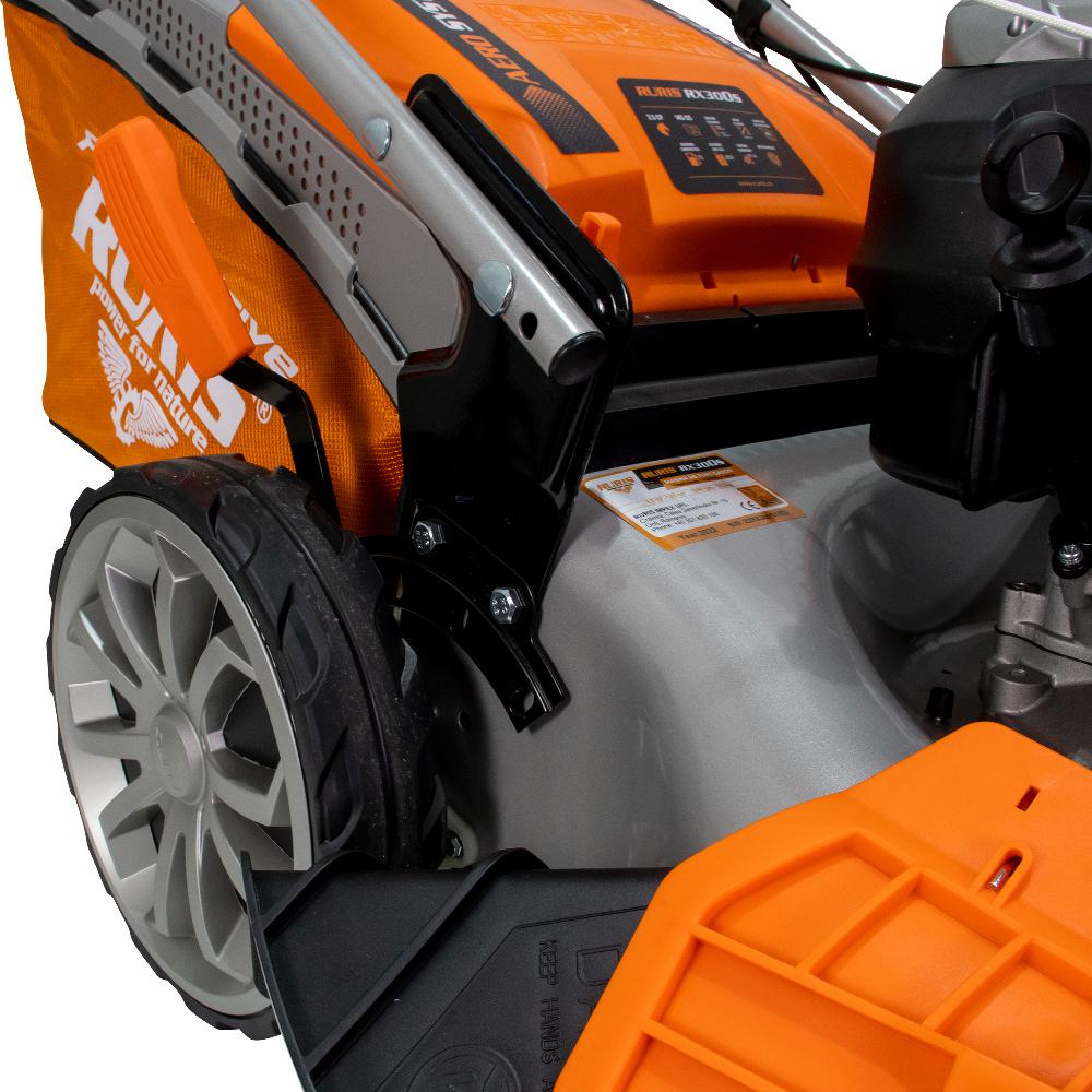 Mașina de tuns gazon RURIS RX300S este dotată cu un motor în 4 timpi de 3.5 CP, având o lățime de lucru de 46 centimetri. Acest model poate fi utilizat pentru tunderea ierbii pe o suprafață de până la 1500mp. Un aspect important pentru obţinerea unei peluze perfecte este înălţimea de tăiere a ierbii. La acest model, înălțimea de tăiere este cuprinsă între 25-75 mm, putând fi reglată în 7 trepte, prin acționarea dispozitivului lateral situat la baza şasiului.Cu RURIS RX300S beneficiați de 5 funcții într-o singură mașină de tuns gazon: colectare, evacuare în spate, evacuare în lateral, mulching și autocurățare. Diametrul mare al roţilor face posibil tăiatul gazonului şi în zonele înclinate ale solului. Totodată sistemul de autopropulsie oferă confort, eficienţă şi un timp redus de lucru.Mașinile de tuns gazon RURIS sunt robuste și fiabile. Cuva șasiului este din oțel ambutisat ceea ce îi conferă o rezistență mai mare. Sistemul ergonomic de pliere al mânerului şi al sacului colector face ca mașina de tuns gazonul să fie simplu de depozitat sau de transportat. Cu mașinile de tuns gazon de la RURIS, grădinăritul devine mult mai simplu. Acestea sunt ușor de utilizat și întreținut, fiind soluția perfectă pentru îngrijirea gazonului.