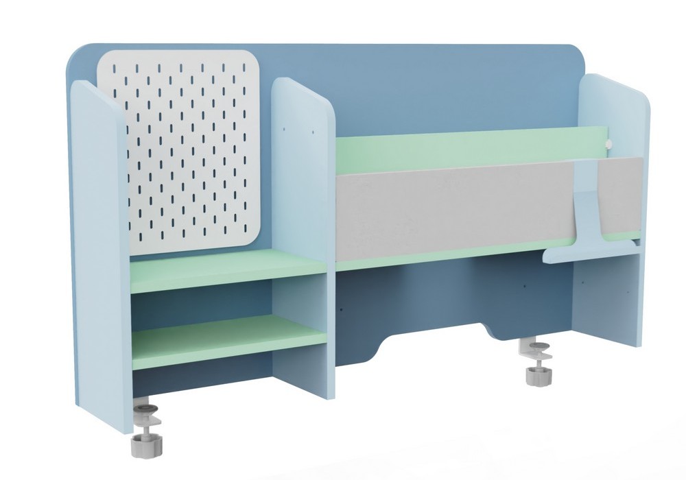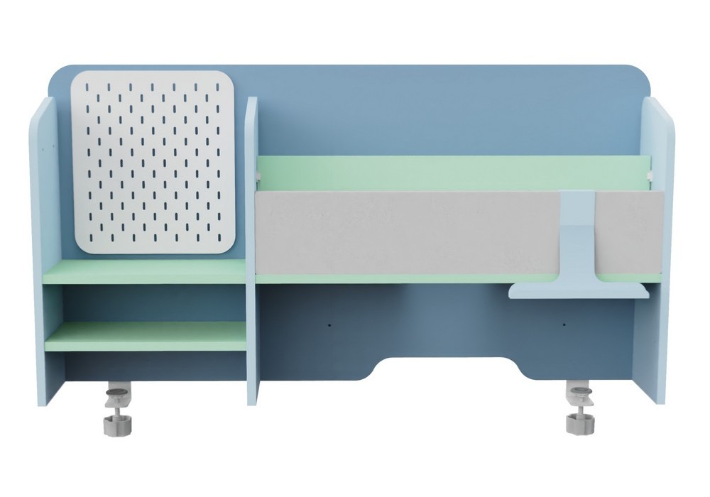 Ergonomic Children Desktop Shelf with Book Stand 1) 16mm Class E1 particle board as back holding and compartment and movable board. 2) 9mm light grey fixed felt board. 3) 240L*145W*1.5Tmm, T shape reading stand, left and right movable. 4) 16mm Class E1 particle board, 0.18*19 edge banding. 5) Children desk universal fixed knob. T-shape corner connector. 6) Combination of 3 types of bookshelf. Can be combined with the desks.