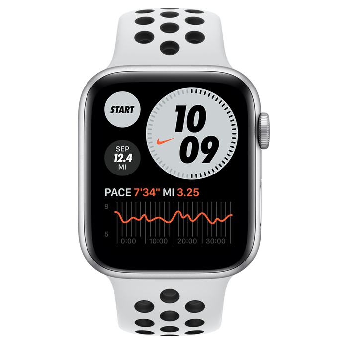 - Ceas inteligent Apple Watch Series 6 GPS MG293, 44mm, Carcasă din aluminiu cu bandă Pure Platinum/Black Nike Sport