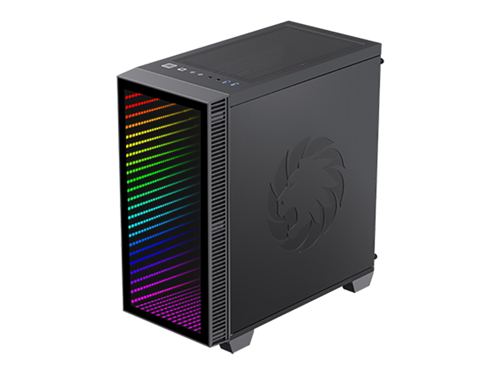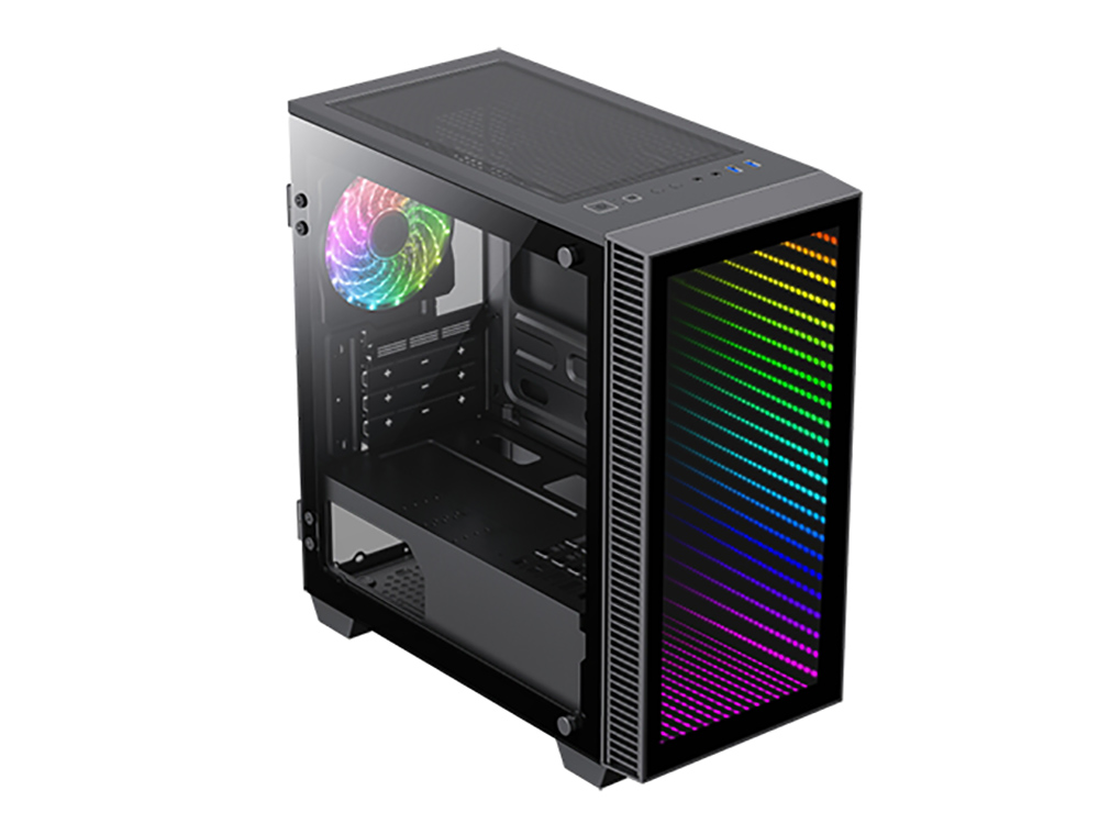 . Form Factor (Midi, Micro, Mini ITX, Full) Micro-ATX, Mini ITX Chassis SPCC 0.6mm, Black painting interior PSU Form Factor Bottom/ATX M/B Form Factor M-ATX、ITX Front Panel ABS,Tempered Glass Top Panel Metal cover Side Panel Left Tempered Glass Right Metal cover External Drive Bay(s) *0 5.25" (ODD) *0 3.5" Internal Drive Bay(s) 3.5" (HDD) *2 2.5" (SSD) *2 I/O Buttons *4 USB3.0(USB3.1 GEN1) Port(s) *2 HD Audio Support *1 Fan Controller *1  PWM RGB Controller *1  Rainbow Controller (ARGB) Controller max. fans *5                                    RGB Controller max. LED strips *2                                  Cooling Fan  Support Front 3x120mm(Fan optional) Top 2x120mm(Fan optional) Rear 1x120mm (Included) (FN-12Rainbow-M) Water Cooling Support Front 120mm*1, 240mm*1 (Radiator Size) Top 120mm*1, 240mm*1 Rear 120mm*1 Dust Cover Bottom and top cover with dust filter Slots *4 VGA Card Length 340mm CPU Cooler Height 155mm Cable Management Depth 19mm