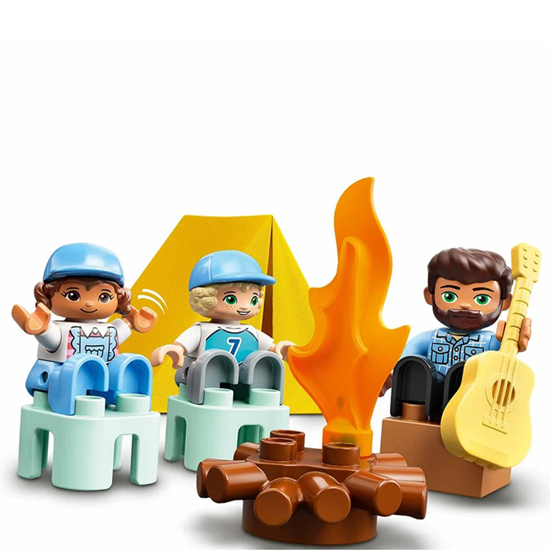 „Camping de familie, aventură cu furgonetă” 4 figurine DUPLO® – un bărbat, o femeie, o fată și un băiat Furgonetă cu roți care se învârtesc și acoperiș detașabil, cort din țesătură, canoe și accesorii distractive Vârsta recomandată: 2+ Număr de piese: 30 Piese