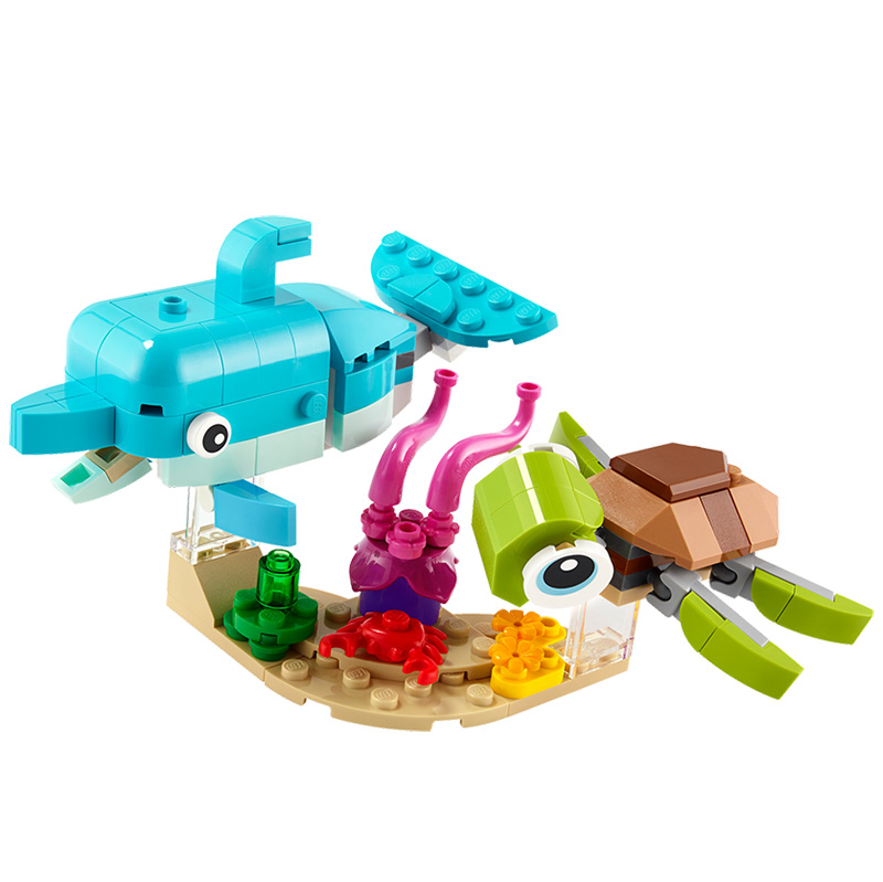 „Delfin și țestoasă” 3 scene superdrăguțe de animale de mare într-un singur set Copiii se pot distra cu 3 scene cu animale de mare: un delfin și o broască țestoasă, un cal de mare și un melc de mare și un pește și un crab Vârsta recomandată: 6+ Număr de piese: 137 Piese