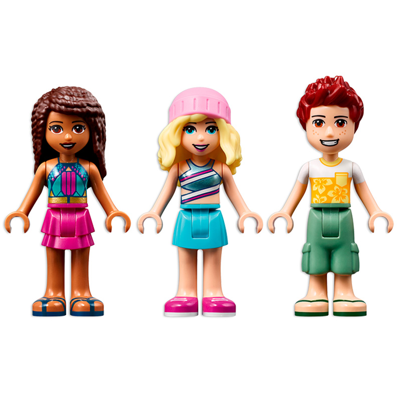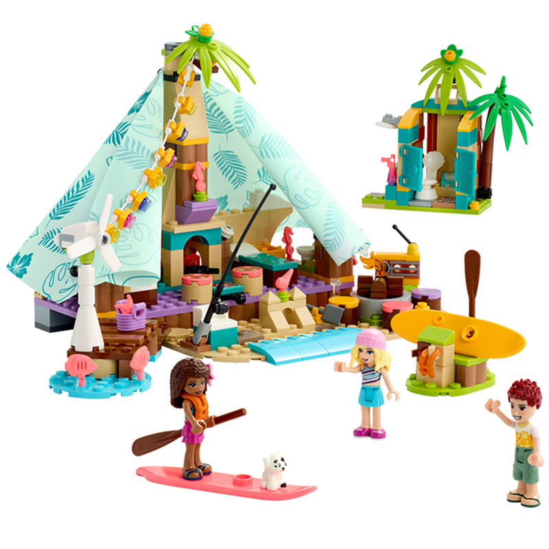 „Glamping pe plajă” LEGO® Friends Beach Glamping include 3 mini-păpuși, un cățeluș, cort cu paturi supraetajate, aragaz și husă din material, plus o turbină eoliană care se învârte pentru a alimenta luminile. Vârsta recomandată: 6+ Număr de piese: 380 Piese