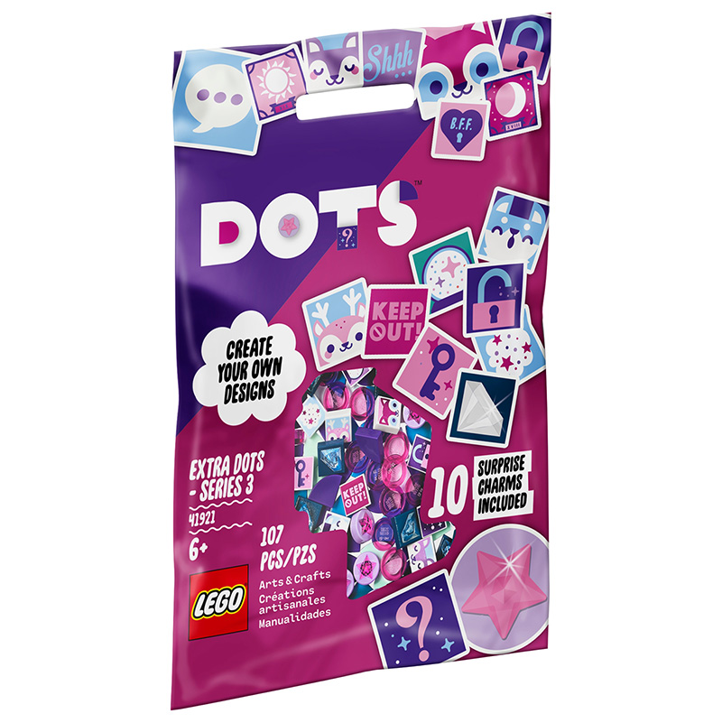 „Extra DOTS - Seria 3” 81 de plăci de colecție în 4 culori, 16 plăci cu stele și diamante cu efect 3D și 10 plăci decorate cu mister Vârsta recomandată: 6+ Număr de piese: 107 Piese