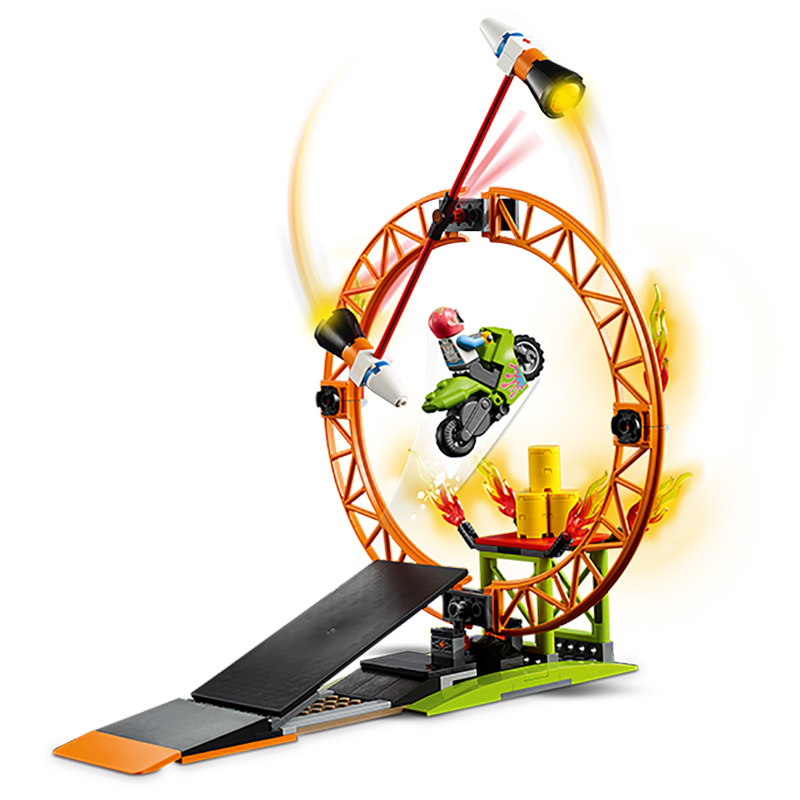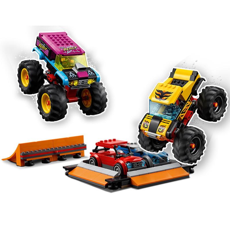 „Arena spectacolului de cascadorii” Include 2 camioane monstru, 2 mașini, un inel de foc, rampe, cascadorii și 6 minifigurine, inclusiv 3 personaje LEGO® City TV Vârsta recomandată: 6+ Număr de piese: 668 Piese