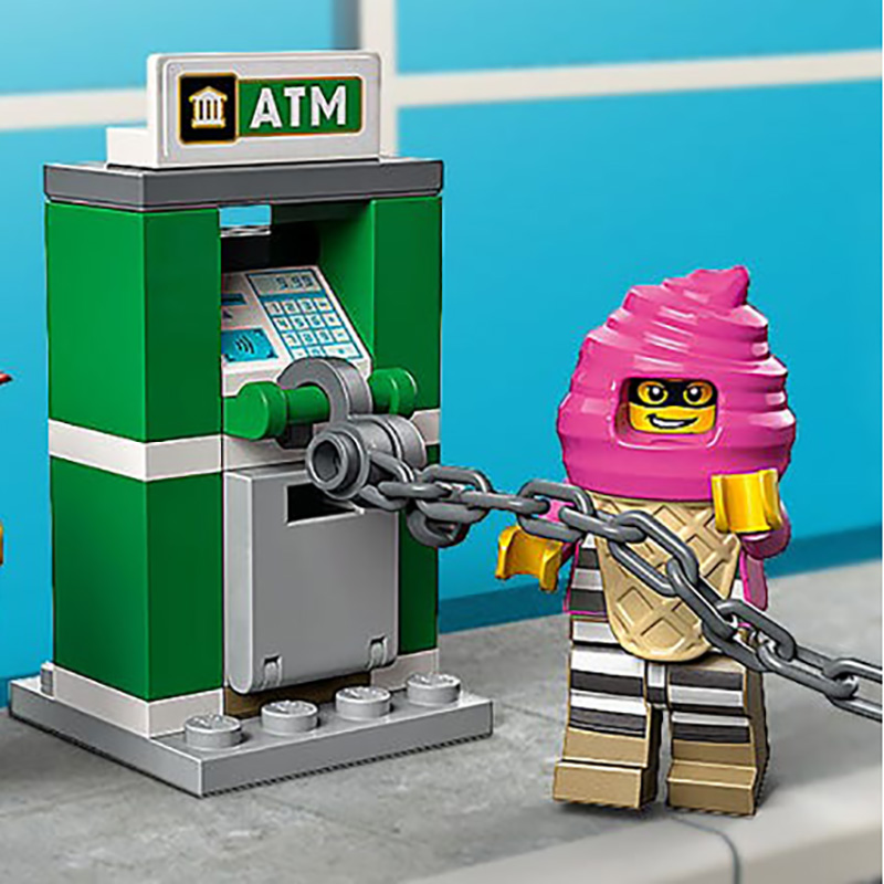 „Goană de poliție după camionul cu înghețată” Set cu o mașină de înghețată, mașină de poliție, un bancomat și 3 minifigurine, inclusiv 2 personaje LEGO® City TV Vârsta recomandată: 5+ Număr de piese: 317 Piese
