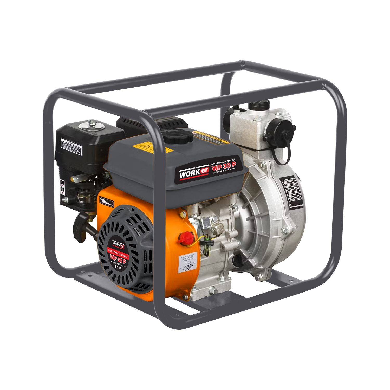 Motopompa TECHNOWORKER WP 30P este un echipament fiabil și puternic, destinat pomparii apei curate în scopuri domestice, agricole și de construcții. Echipată cu un motor pe benzină tip OHV cu răcire cu aer, dezvoltă o putere de 4,8 kW (7 C.P.), oferind o funcționare stabilă chiar și în condiții de utilizare intensă. Capacitatea cilindrică a motorului este de 196 cm³, ceea ce permite o productivitate de până la 540 litri pe minut. Unul dintre avantajele acestei motopompe este înălțimea mare de ridicare a apei — până la 60 metri, ceea ce o face ideală pentru aplicații care necesită pomparea la cote înalte. Adâncimea de aspirație de 8 metri permite extragerea apei din puțuri sau rezervoare adânci. Diametrele orificiilor de intrare și evacuare sunt de 50 mm, fiind compatibile cu majoritatea furtunurilor și racordurilor. Sistemul de pornire manuală asigură un start rapid și sigur, chiar și la temperaturi scăzute. Rezervorul de combustibil are o capacitate de 3,6 litri, oferind o autonomie bună în utilizare. Consumul redus de combustibil, de doar 395 g/kW.h, contribuie la eficiența economică a echipamentului. Dimensiunile compacte (510x380x440 mm) și greutatea de 23 kg permit o manipulare ușoară și depozitare facilă. Carcasa este fabricată din materiale rezistente, protejând componentele interne de șocuri și umezeală. TECHNOWORKER WP 30P combină fiabilitatea, performanța ridicată și ușurința în întreținere. Este alegerea ideală pentru cei care caută o motopompă eficientă și durabilă pentru utilizare zilnică în diverse condiții.