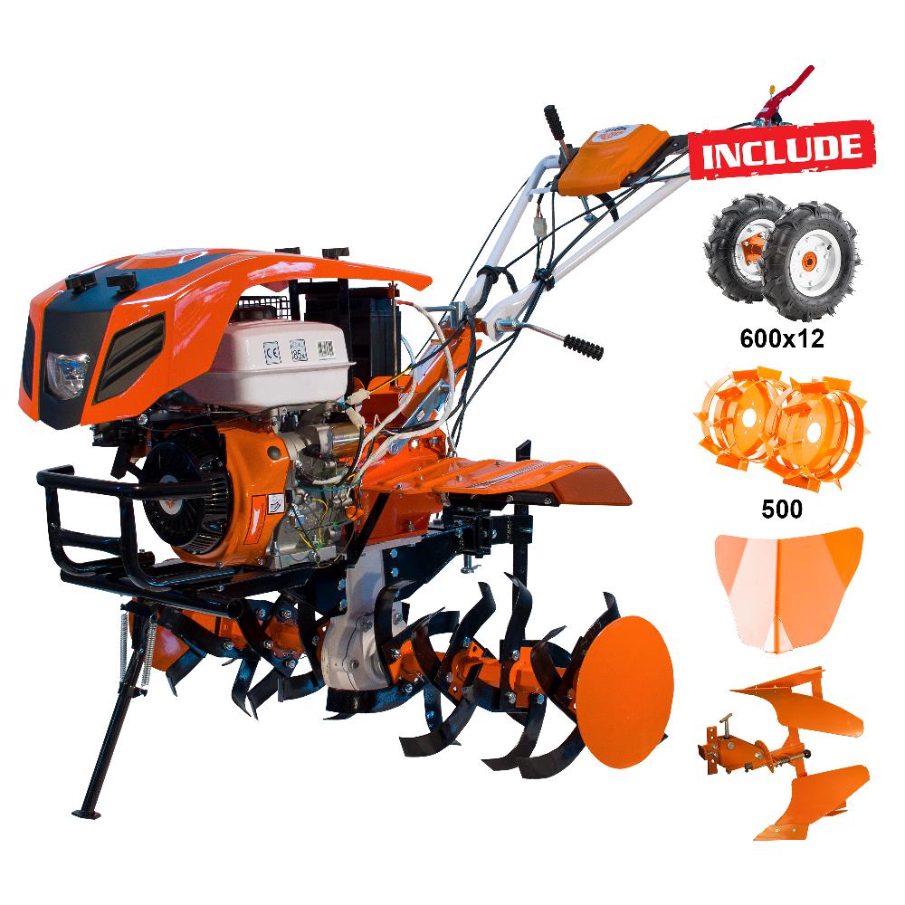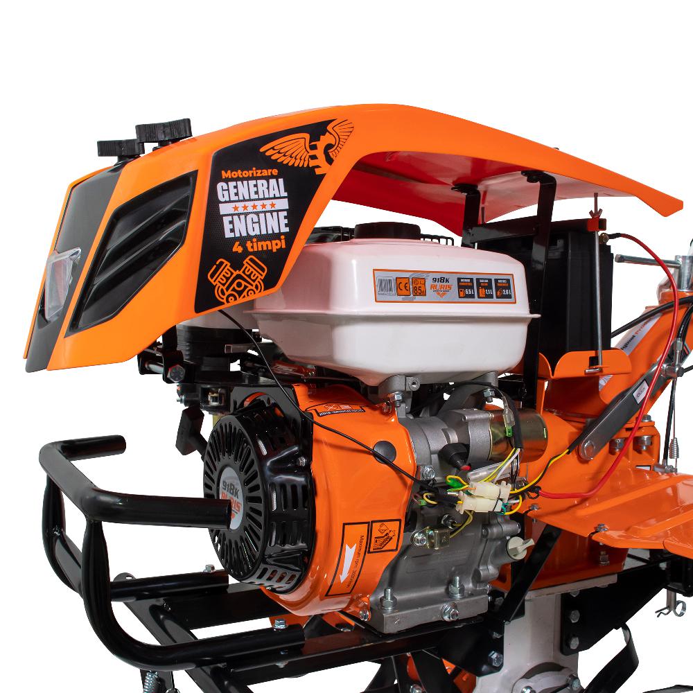 Motosăpătoarea profesională RURIS 918ACC este echipată cu un motor General Engine de 18 CP și freze pentru săpat cu o lățime reglabilă cuprinsă între 750 mm și 1100 mm.Motorul puternic, cutia de viteze 2 înainte +1 înapoi și transmisia cu pinioane conice fac din Motosăpătoarea profesională RURIS 918ACC un utilaj perfect pentru transportul cu remorcă putând tracta cu ușurință încărcătură de 1000 kg.Pentru o pornire mai ușoară, Motosăpătoarea RURIS 918ACC este echipată cu un sistem de pornire automată la cheie.În plus, maneta schimbătorului de viteze este poziționată la nivelul mâinilor ceea ce permite ca selectarea vitezei dorite să fie realizată mai ușor.Un al atu este și faptul că Motosăpătoarea profesională RURIS 918ACC este echipată cu un sistem de iluminare care permite utilizarea acesteia și în condiții mai slabe de vizibilitate sau după lăsarea serii.Carcasa transmisiei Motosăpătoarei profesionale RURIS 918ACC nu necesită întreținere specială și poate fi folosită pe toate grupele de soluri. Aceasta este din fontă nodulară, rezistentă la șocuri și uzură mecanică.
