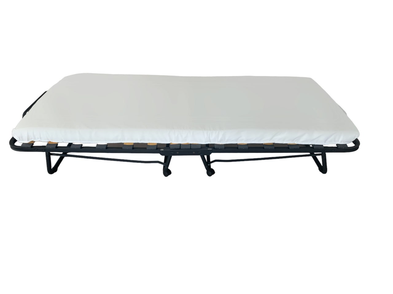 Paturile pliante cu saltea JUMI 90x200 cm (8 cm) oferă o soluție convenabilă pentru odihnă și somn confortabil. Cadru este realizat din metal cu țeavă rotundă de diametru 25 mm, asigurând rezistență și durabilitate. Dimensiunile patului sunt de 90x200 cm, oferind un spațiu generos pentru un somn relaxant. Baza cu roți, având o înălțime de 180 mm, permite mutarea ușoară a patului. Construcția include 12 lamele de lemn cu dimensiuni de 53x8 mm, care oferă suport optim pentru saltea. Patul este echipat cu patru picioare pliante care reduc semnificativ volumul atunci când este pliat. Picioarele sunt dotate cu roți din plastic și capace de protecție. Setul include o saltea din spumă cu grosimea de 8 cm și densitatea de 16 km/m², asigurând un somn confortabil. Husa saltelei este realizată din material neted, facilitând întreținerea și oferind un aspect elegant.