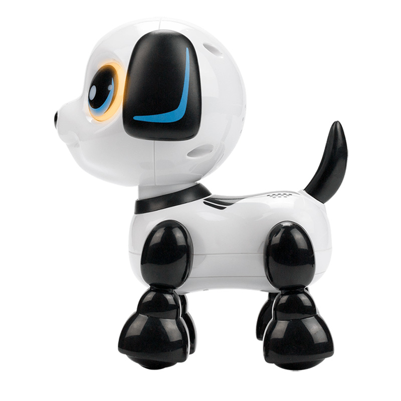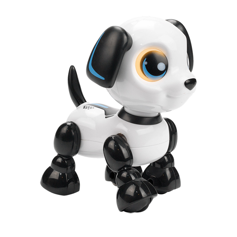 Pentru copii de la 3 ani în sus! Robot interactiv care vine și pleacă cu o singură atingere! Împingeți-i capul în jos, va latră și va merge înainte! Ridică-i capul în sus, va lătra și va merge înapoi! Difuzor pentru sunet viu SFX Ochi cu LED-uri