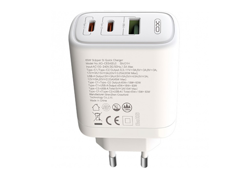 - Wall Charger XO, Type-C PD65W/USB-A QC45W fast charger, 65W, CE04A, white