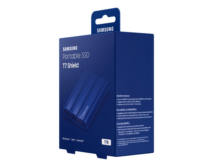 - 1.0TB Samsung Portable SSD T7 Shield Blue, USB-C 3.1 (88x59x13mm, 98g, R/W:1050/1000MB/s, IP65)