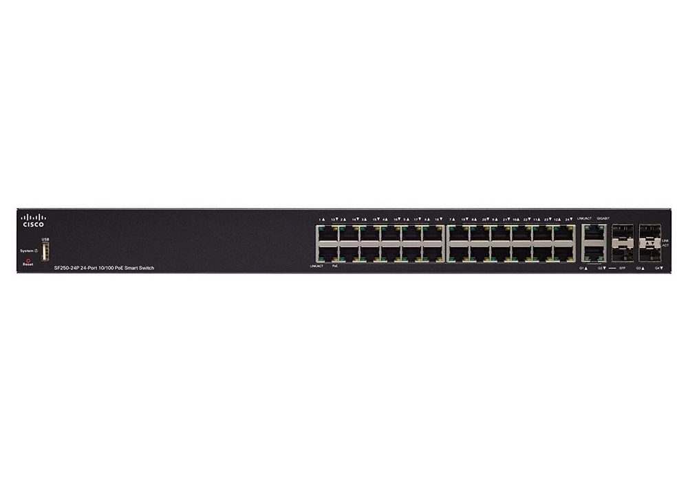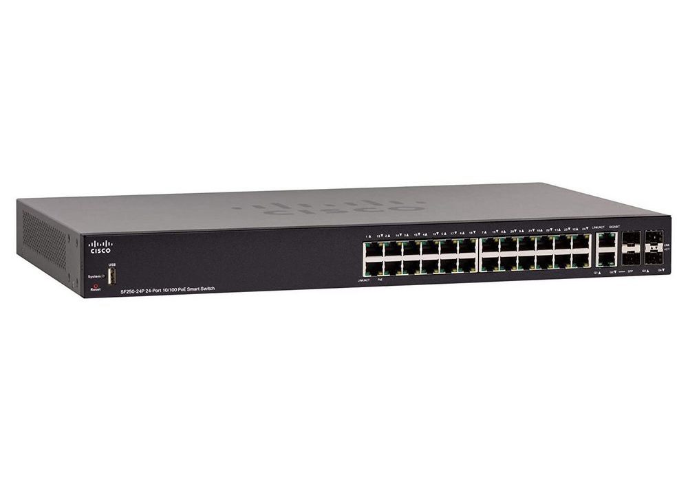 - Сетевой коммутатор Cisco SF250-24P, 24x 10/100 Мбит/с, 4x SFP