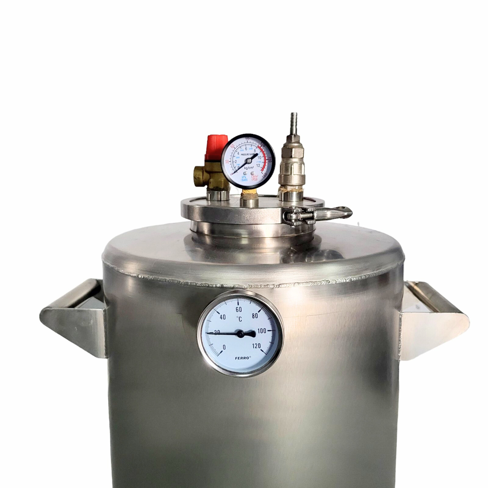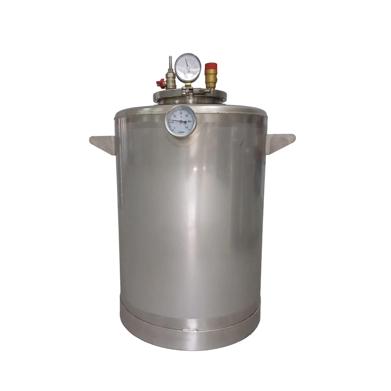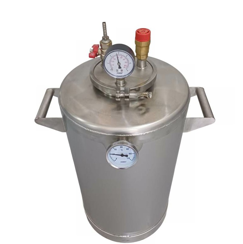 Автоклав на 40 литров из пищевой нержавеющей стали AISI 304 идеально подходит для консервации и стерилизации различных объемов банок. Он оснащен термометром с максимальной температурой до 120°C и может работать в диапазоне температур от 105°C до 120°C. Максимальная температура, которую он может достигать, составляет 125°C. Встроенный манометр позволяет контролировать давление до 6 бар, с рабочим давлением от 3 до 4 бар и максимальным давлением до 5 бар. Толщина стенок автоклава составляет 1,5 мм, а дна - 2 мм, что обеспечивает прочность и надежность конструкции.