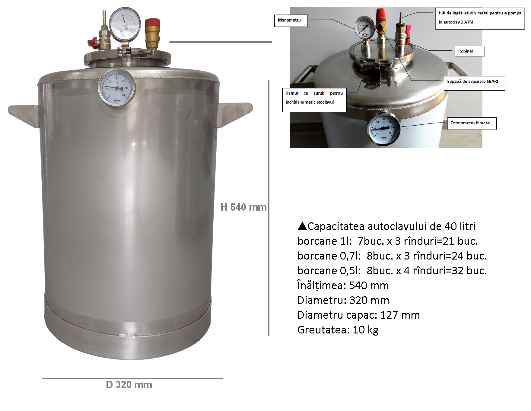 Высота автоклава составляет 540 мм, диаметр - 320 мм, а диаметр крышки - 127 мм. Его вес составляет 10 кг, что обеспечивает устойчивость и легкость в использовании.
