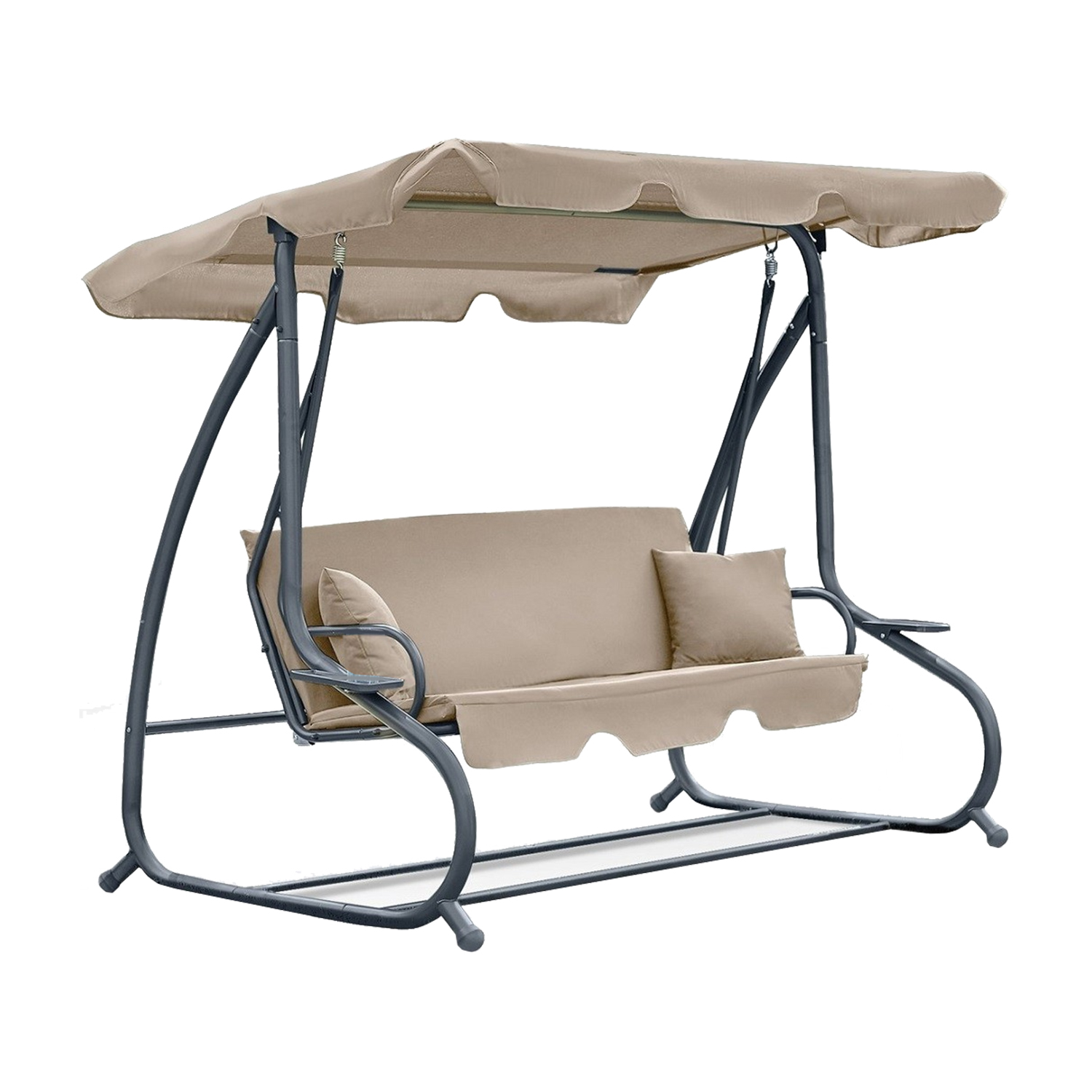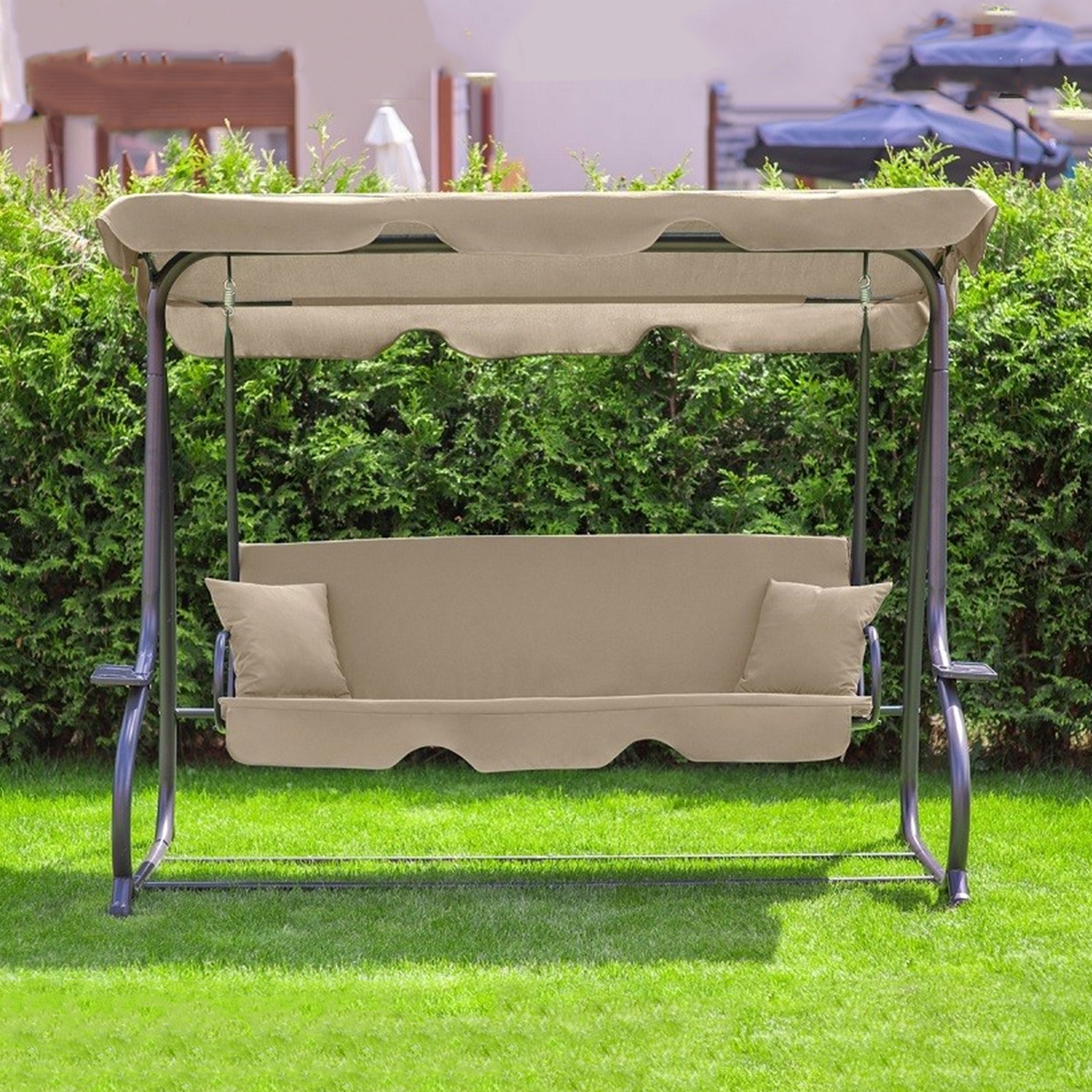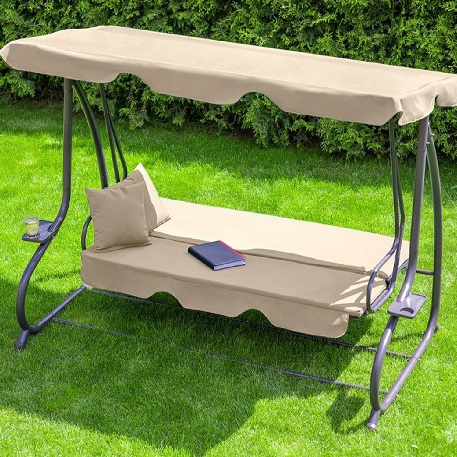 Качели-кровать CORFU в бежевом цвете – идеальное решение для комфортного отдыха на свежем воздухе. Их размеры составляют 200x120x164 см, что позволяет удобно разместиться трем людям. Каркас качелей выполнен из прочной стали, обеспечивающей долговечность и надежность конструкции. Обивка изготовлена из полиэстера и ПВХ плотностью 160 г/м², что делает её устойчивой к воздействию погодных условий и легкой в уходе. Высота качелей составляет 1640 мм, ширина – 2000 мм, а глубина – 1200 мм, что обеспечивает простор и комфорт. Козырек регулируется, позволяя настроить его под нужный угол для защиты от солнца. Спинка также имеет регулировку наклона, что позволяет выбрать наиболее удобное положение для отдыха. В комплект входит съемный матрас, обеспечивающий дополнительный комфорт. Тент добавляет тень и защиту, делая пребывание на улице более приятным. Максимальная нагрузка составляет 150 кг, что делает качели надежными и безопасными. Эти качели-кровать рассчитаны на троих человек, что позволяет наслаждаться отдыхом в компании семьи или друзей. Модель CORFU сочетает в себе стиль, функциональность и комфорт, идеально подходя для любого открытого пространства.
