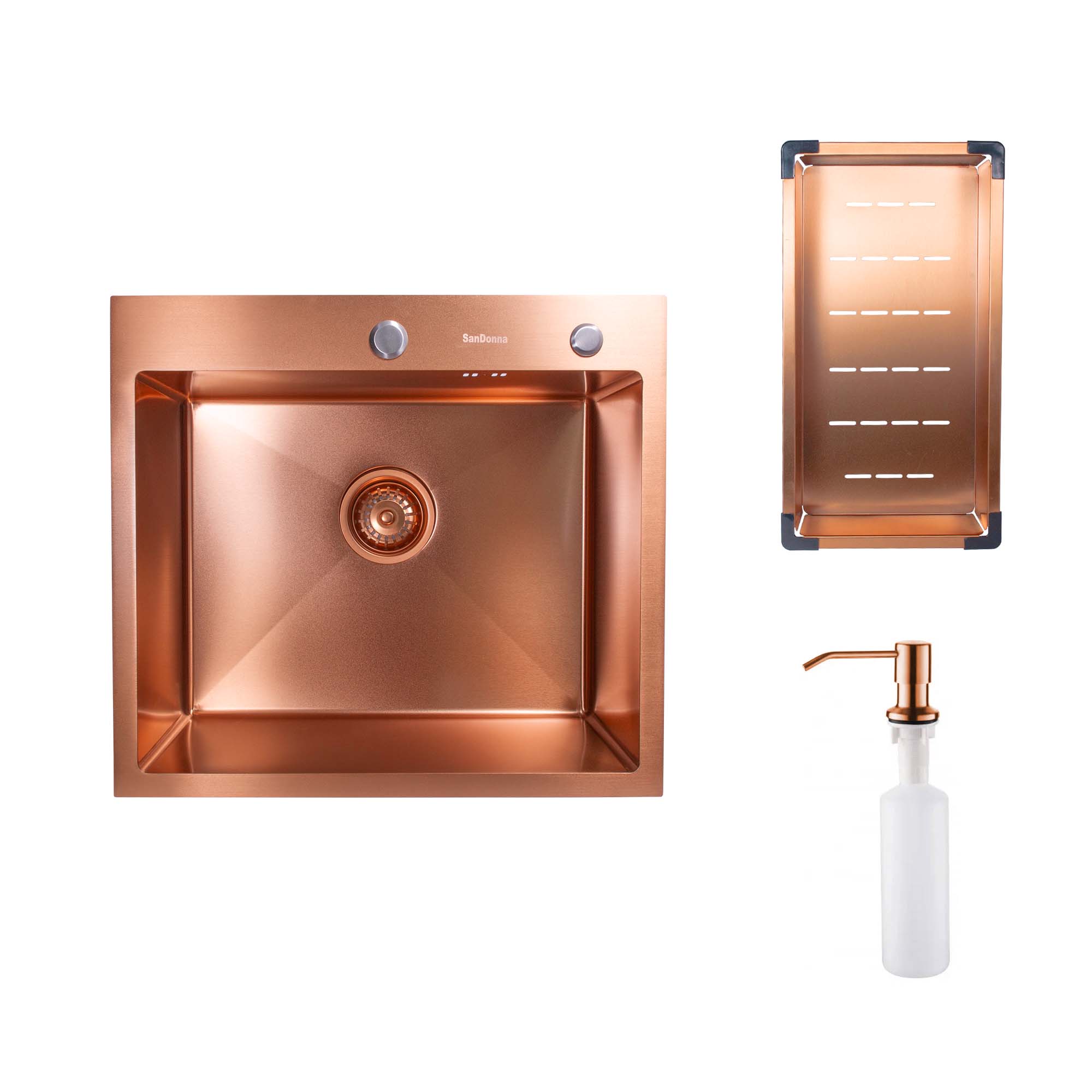 Ручная кухонная мойка SanDonna HD5550 в цвете медь (Copper) — это идеальное сочетание стиля, качества и функциональности. С размерами 550×500 мм и глубиной 230 мм, она обеспечивает достаточное пространство для комфортной работы на кухне. Изготовлена из прочного материала толщиной 3.0+1.0 мм, что гарантирует устойчивость к повреждениям и длительный срок службы. Матовое медное покрытие придаёт мойке роскошный и современный вид, легко вписывающийся в различные интерьерные стили. В комплект входят шумоизоляционный резиновый слой, сифон, 8 крепёжных клипс, дозатор для мыла и лоток для отходов — все элементы выполнены в цвете мойки. Благодаря продуманной глубине, уменьшается разбрызгивание воды и улучшается удобство при мытье посуды. Мойка подходит как для классических, так и для дизайнерских кухонь. Ручная обработка обеспечивает точность форм и аккуратные швы. Простая установка делает её удобной как для профессионалов, так и для самостоятельного монтажа. SanDonna HD5550 — это выбор тех, кто ценит эстетику, надежность и продуманный функционал.
