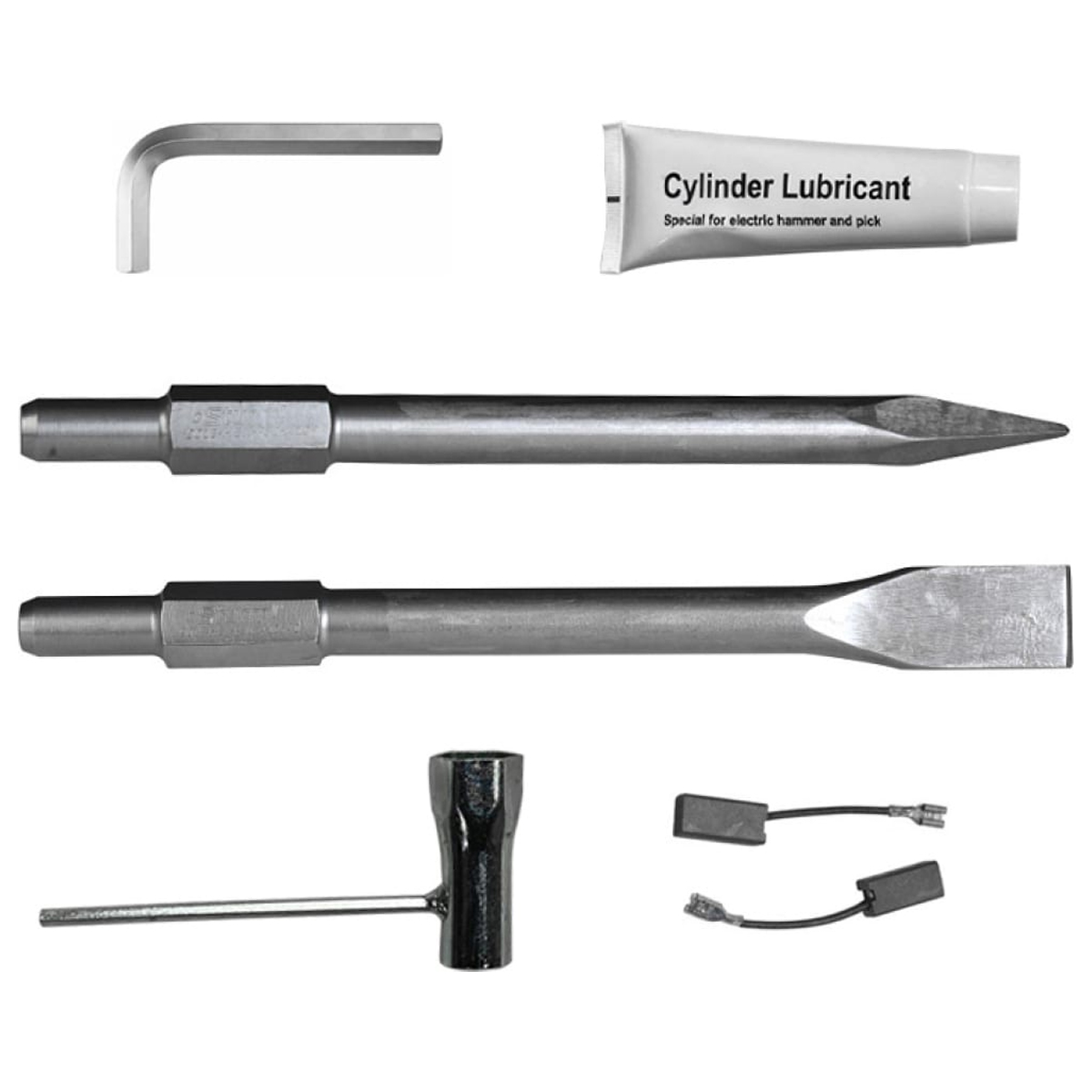 Кроме того, в комплект входят пара угольных щеток для поддержания оптимальной работы молотка, а также бутылочка с маслом для смазки и обслуживания. Два шестигранных ключа полезны для быстрой смены насадок и их регулировки.