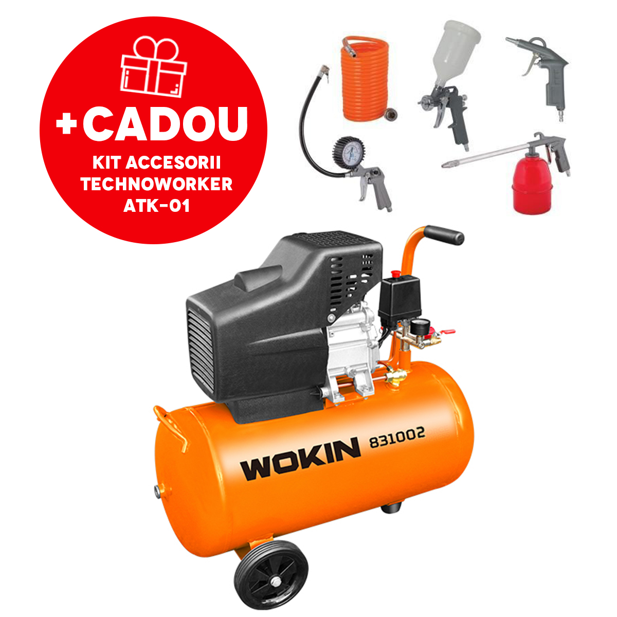 - Воздушный компрессор 24Л 1500Вт Wokin + Набор TechnoWorker ATK-01 (5 шт.)