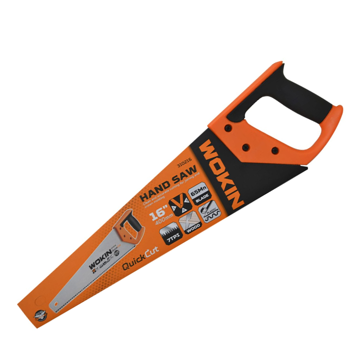 Ножовка по дереву от марки WOKIN служит для продольного и поперечного распила заготовок из древесины и пластика. Ножовка обладает высококачественным полотном из 65Mn (конструкционной стали) с длиной 400 мм. Зубья пилы с трехсторонней заточкой имеют шаг зубьев 7 TPI с термообработкой. Двухкомпонентная рукоятка обеспечивает удобный хват и максимальный контроль инструмента по время работы. Для удобного хранения в полотне предусмотрено специальное отверстие для подвешивания.