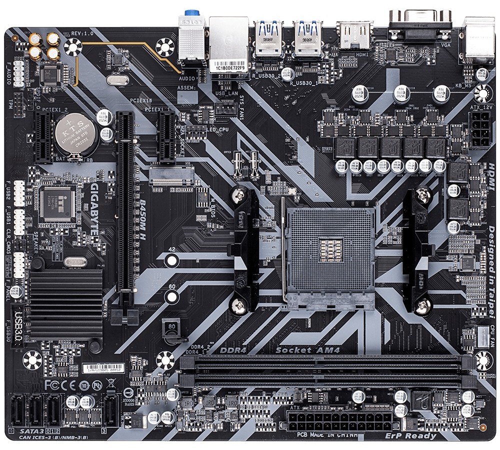 // CPU AMD Socket AM4, support for: Supports AMD Ryzen™ 5000 series / Ryzen™ 5000 G-Series/ 3rd Gen Ryzen™/ 2nd Gen Ryzen™/ 1st Gen Ryzen™/ 2nd Gen Ryzen™ with Radeon™ Vega Graphics/ 1st Gen Ryzen™ with Radeon™ Vega Graphics/ Athlon™ with Radeon™ Vega Graphics Processors Chipset AMD B450 Memory 2 x DDR4 DIMM sockets supporting up to 64 GB (32 GB single DIMM capacity) of system memory Dual channel memory architecture Support for DDR4 3600(O.C.)/3466(O.C.)/2933/2667/2400/2133 MHz memory modules Onboard Graphics Integrated Graphics Processor: 1 x D-Sub port, supporting a maximum resolution of 1920x1200@60 Hz 1 x HDMI port, supporting a maximum resolution of 4096x2160@60 Hz Maximum shared memory of 16 GB Audio Realtek® ALC887 codec High Definition Audio 2/4/5.1/7.1-channel Support for S/PDIF Out LAN Realtek® GbE LAN chip (10/100/1000 Mbit) Expansion Slots 1 x PCI Express x16 slot, running at x16 2 x PCI Express x1 slots Storage Interface 1 x M.2 connector (Socket 3, M key, type 2242/2260/2280 SATA and PCIe x4/x2* SSD support) 4 x SATA 6Gb/s connectors Support for RAID 0, RAID 1, and RAID 10 USB 2 x USB 3.1 Gen 1 ports available through the internal USB header 6 x USB 2.0/1.1 ports (2 ports on the back panel, 4 ports available through the internal USB headers) 4 x USB 3.1 Gen 1 ports on the back panel
