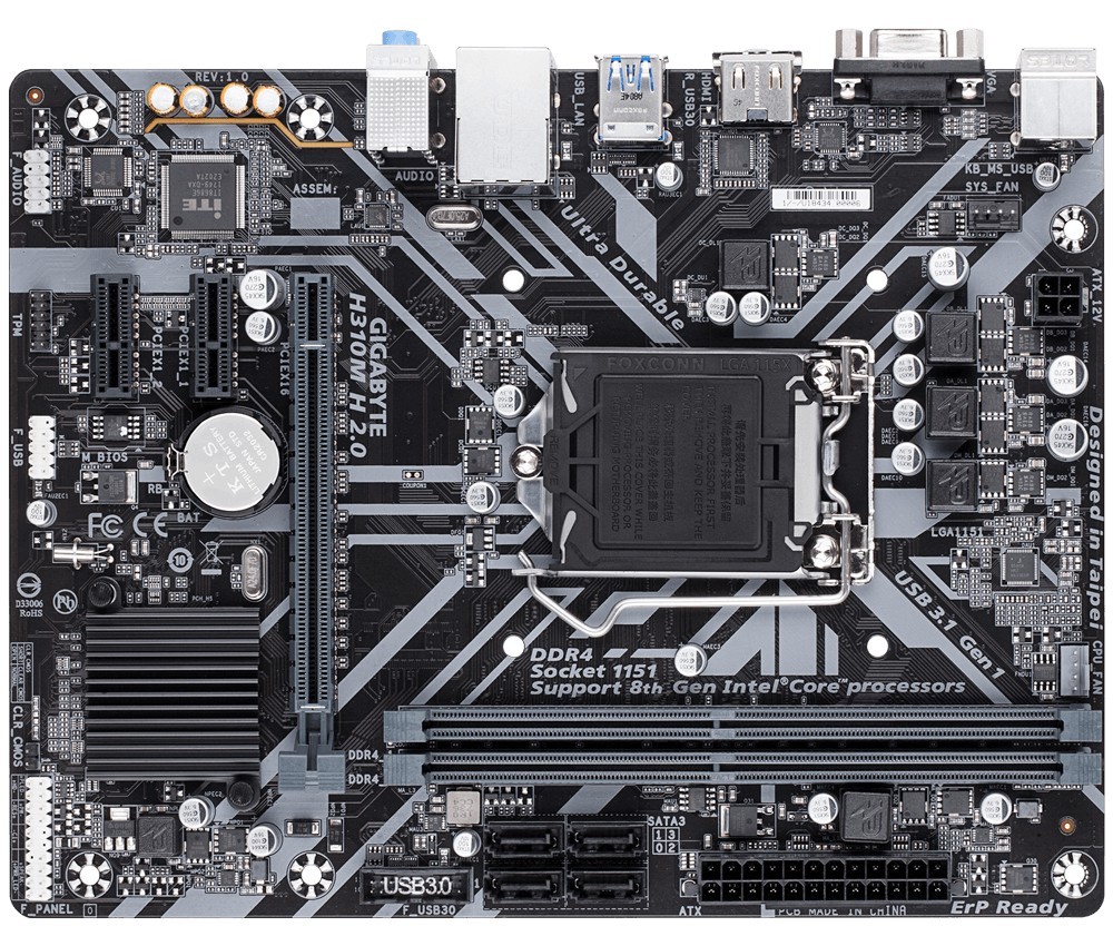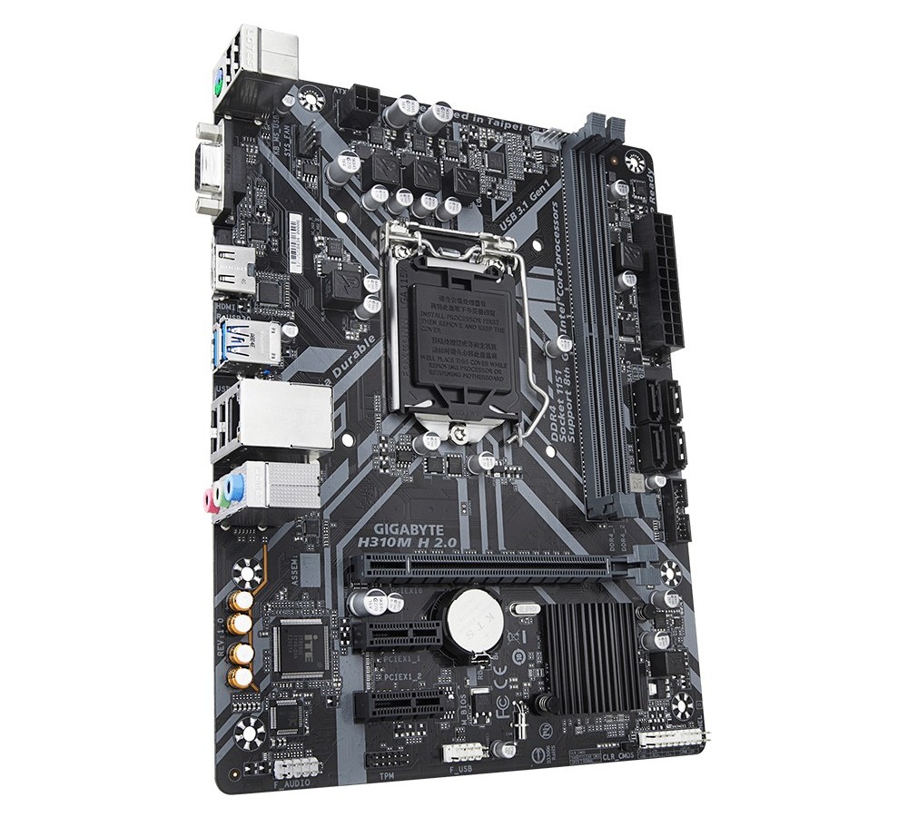 // CPU Supports 9th and 8th Gen Intel® Core™ Processors Chipset Intel® H310 Memory 2 x DDR4 DIMM sockets supporting up to 32 GB of system memory Dual channel memory architecture Support for DDR4 2666/2400/2133 MHz memory modules Onboard Graphics Integrated Graphics Processor-Intel® HD Graphics support: 1 x D-Sub port, supporting a maximum resolution of 1920x1200@60 Hz 1 x HDMI port, supporting a maximum resolution of 4096x2160@30 Hz Maximum shared memory of 1 GB Audio Realtek® ALC887 codec High Definition Audio 2/4/5.1/7.1-channel LAN Realtek® GbE LAN chip (10/100/1000 Mbit) Expansion Slots 1 x PCI Express x16 slot, running at x16 2 x PCI Express x1 slots Storage Interface Chipset: 4 x SATA 6Gb/s connectors USB - Chipset: 4 x USB 3.1 Gen 1 ports (2 ports on the back panel, 2 ports available through the internal USB header) 6 x USB 2.0/1.1 ports (4 ports on the back panel, 2 ports available through the internal USB header)