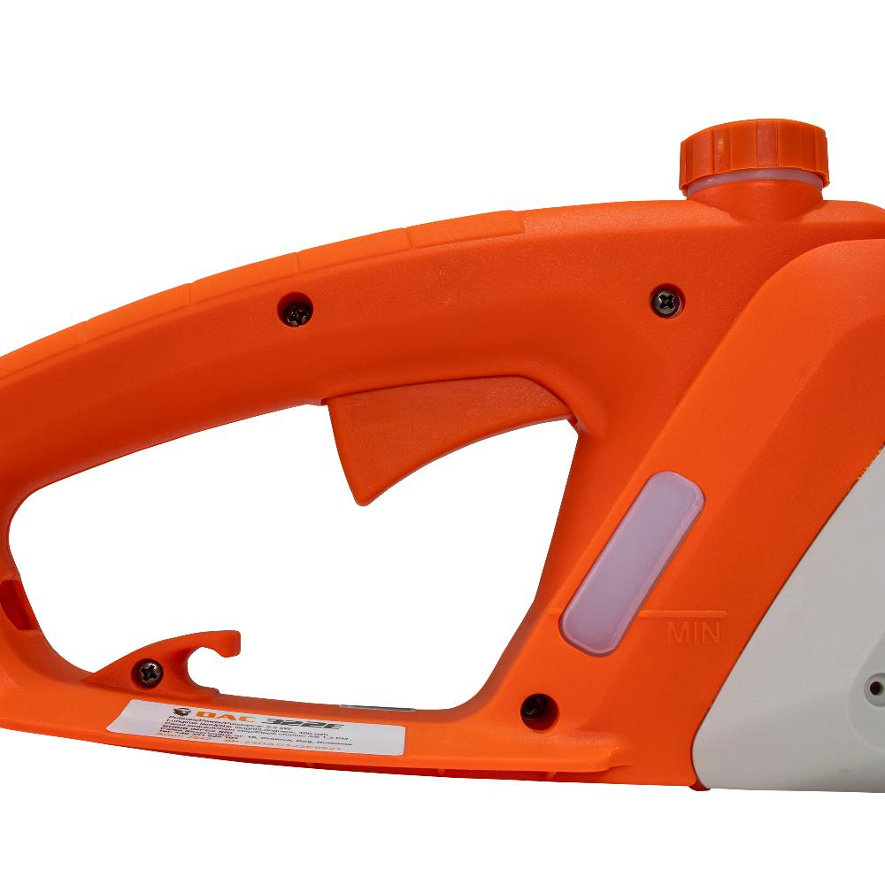 Модель DAC 322E проста в использовании благодаря небольшому весу и эргономичной форме. Вибрации, издаваемые цепью под нагрузкой, минимальны по сравнению с классической электропилой, что обеспечивает длительное использование в процессе эксплуатации и повышенный комфорт. Быстрорегулируемый натяжитель цепи позволяет пользователю устанавливать, снимать и натягивать цепь без ручных инструментов, как на бензопиле с термическим двигателем. Длина рельса 400 мм позволяет распиливать деревянные массивы диаметром 700 мм. Бензопила DAC 322E, простая в использовании даже людьми без технических знаний, станет для вас идеальным выбором.
