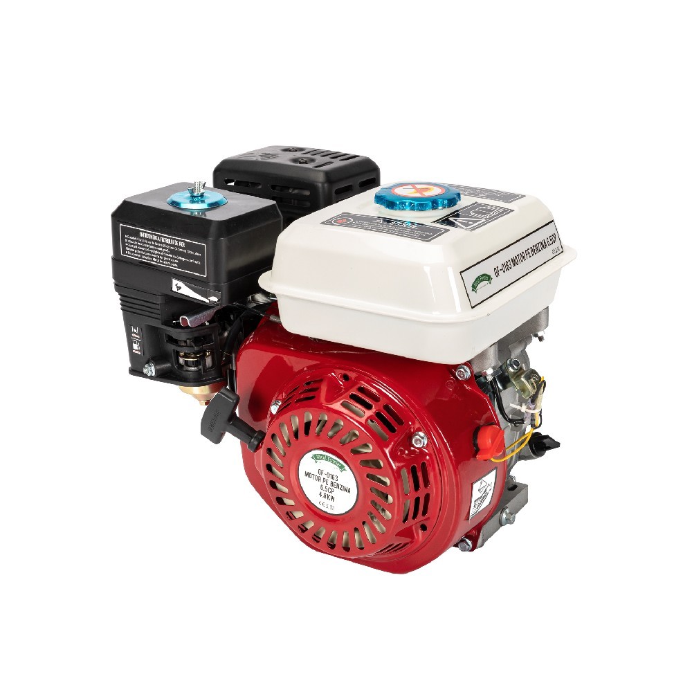 Бензиновый двигатель 6,5 л.с. с горизонтальным валом, модель GF-0163, представляет собой надежный и эффективный агрегат, предназначенный для широкого спектра бытовых и хозяйственных применений. Он идеально подходит для использования в газонокосилках, мотоблоках, мотокосах, строительных и промышленных машинах, генераторах, сельскохозяйственном оборудовании и насосах для ирригации. Двигатель оснащен системой воздушного охлаждения и запускается вручную с помощью шнура. Для работы используется неэтилированный бензин CO90, а для смазки — моторное масло 15W-40. Максимальный крутящий момент двигателя составляет 13,2 Нм, а рабочий объем — 196 см³. Диаметр цилиндра равен 68 мм, ход поршня — 45 мм. Двигатель разработан для работы при температурах от -5°C до 40°C на высоте до 1000 м над уровнем моря. При температурах ниже 40°C рекомендуется чаще менять масло, так как при обычной температуре 20°C масло может нагреваться до 120°C. Если температура окружающей среды превышает 40°C или высота над уровнем моря более 1000 м, мощность двигателя может снижаться из-за уменьшения плотности воздуха. Двигатель может быть хранен и транспортирован при температурах от -15°C до 55°C.