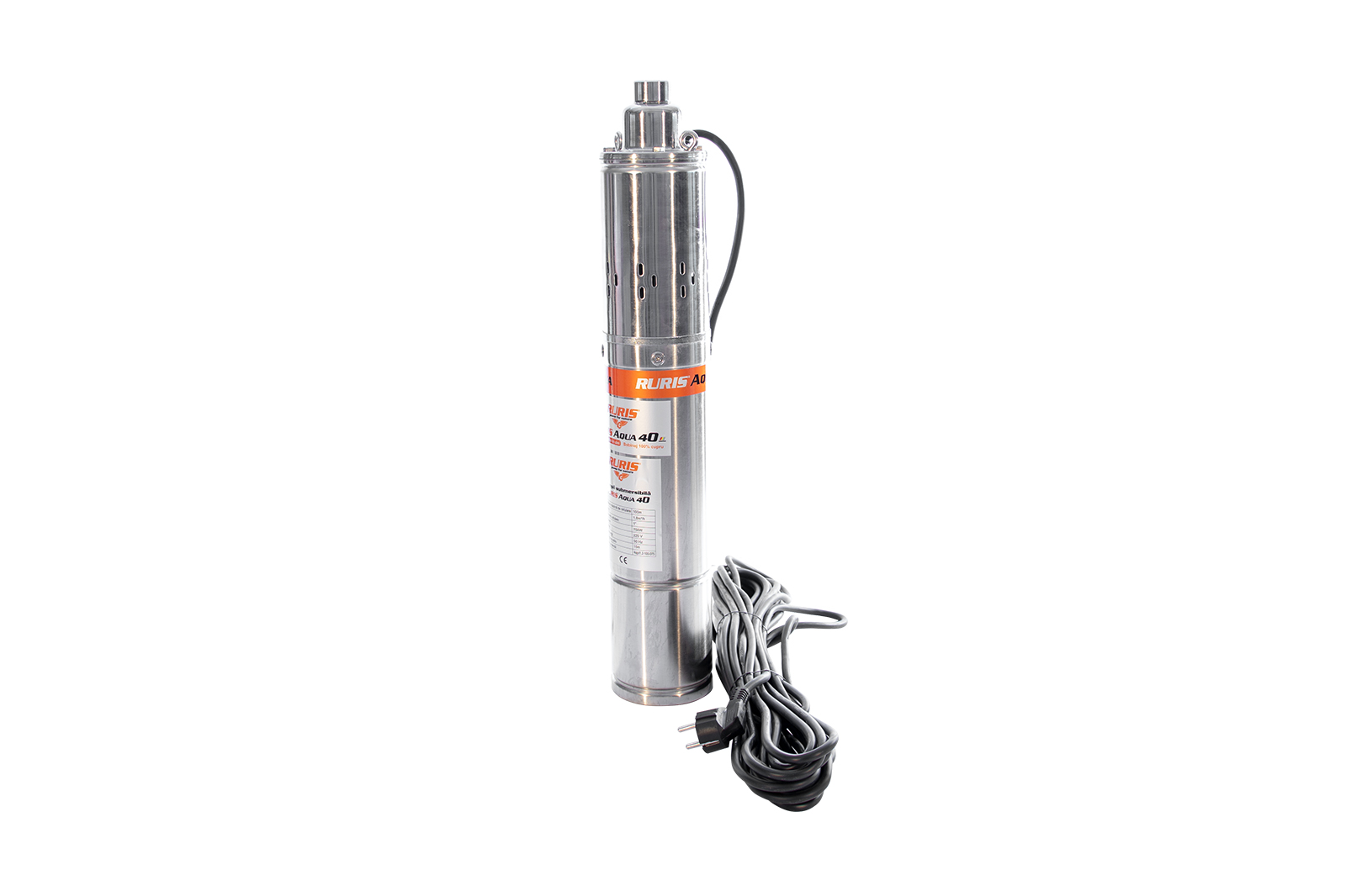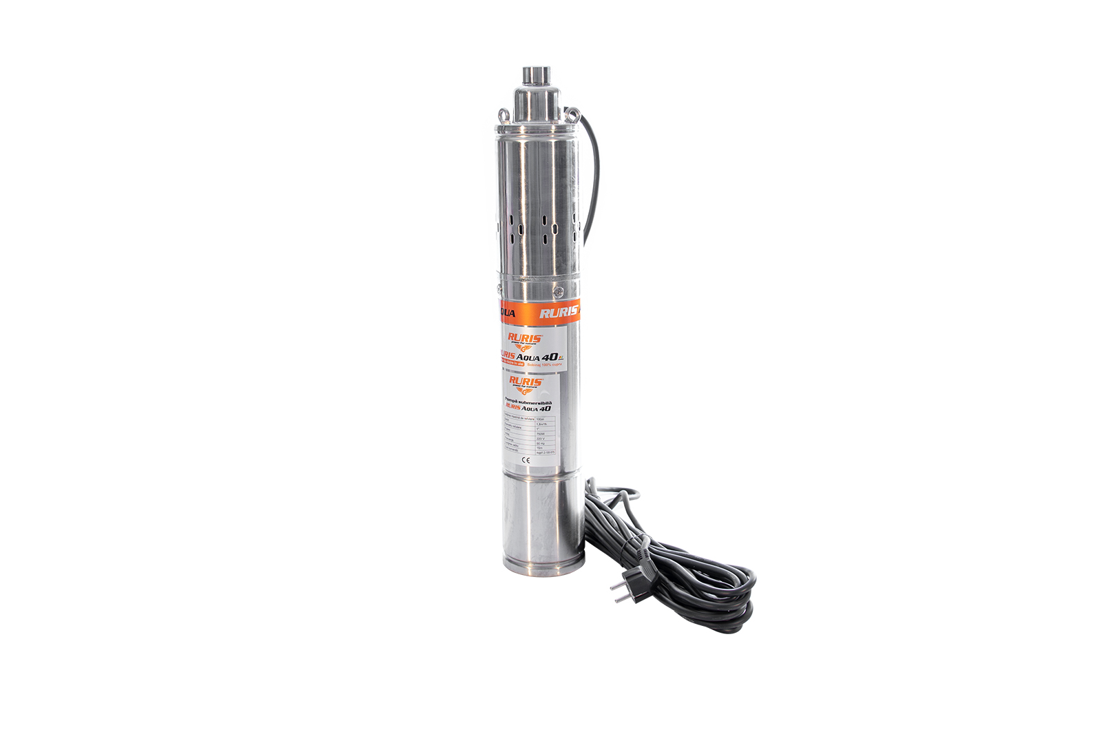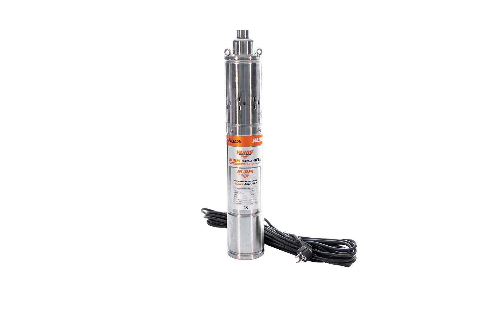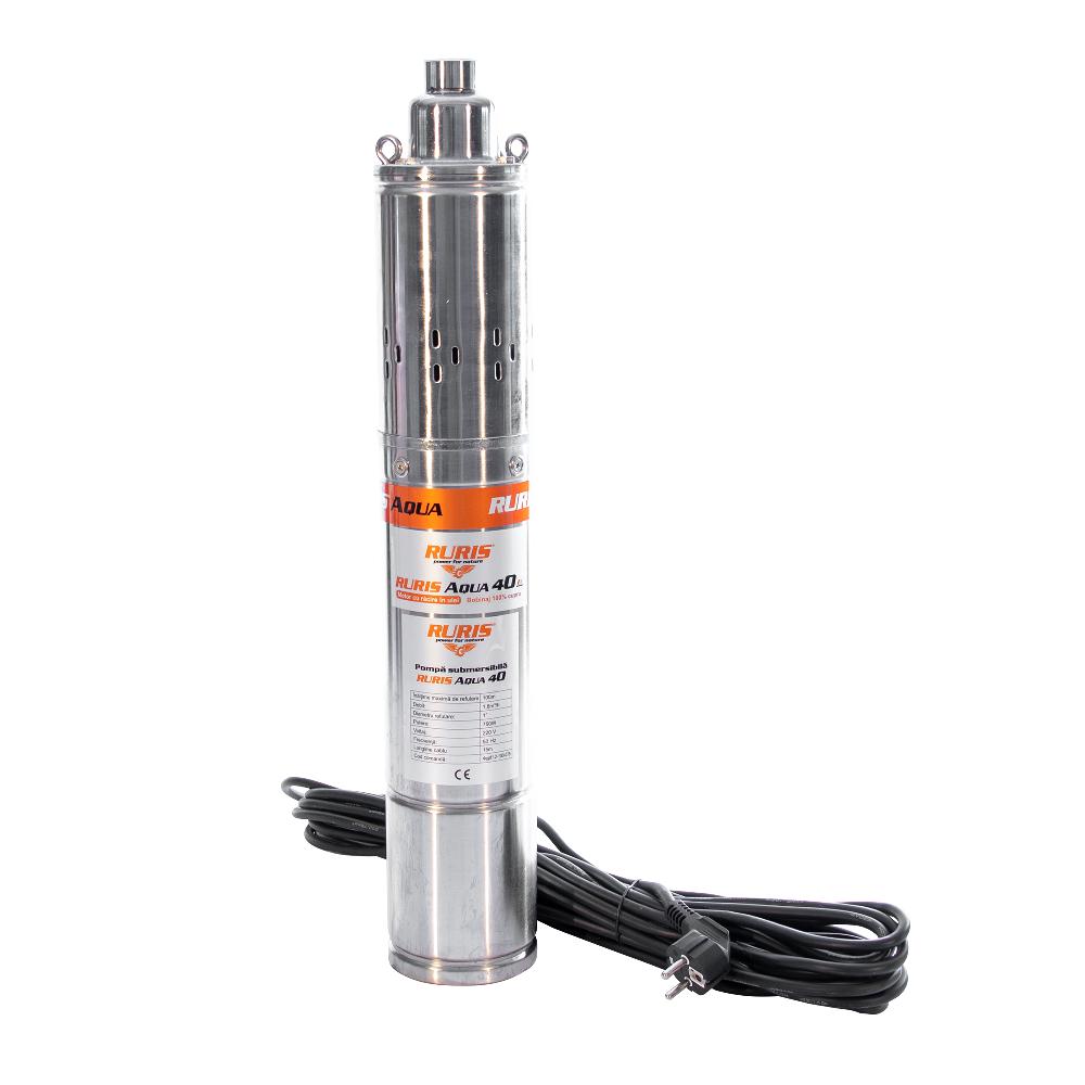 Pompa submersibilă RURIS Aqua 40 este o pompă de adâncime folosită pentru alimentarea cu apă curată a gospodăriilor sau diverşilor consumatori precum instalaţiile de irigat. Apa poate fi pompată din fântâni sau puţuri de la o adâncime de până la 100m. Motorul pompei este de 750W cu bobinaj 100% din cupru, iar construcţia pompei este de tip şurub.