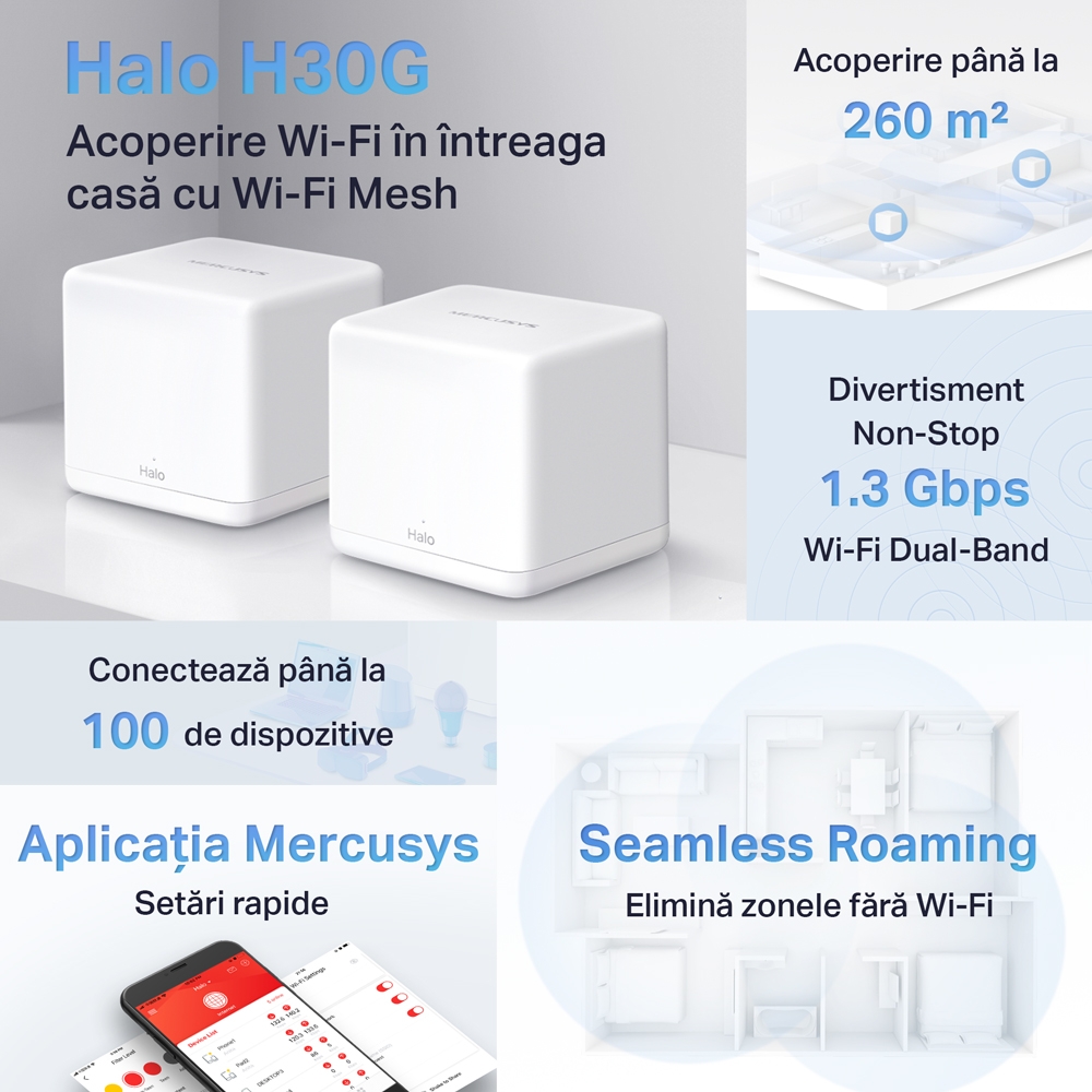 - Домашняя Mesh Wi-Fi система MERCUSYS Halo H30G (2-pack), Белый